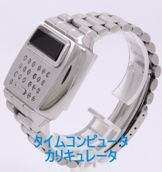 タイムコンピュータカリキュレータは、先に紹介した初のLED腕時計「タイムコンピュータ」の上位モデルで、腕時計で初めて電卓機能を搭載したモデルです。上の画像を見ていただいても、非常に、個性的なデザインをもっていることが分かります。