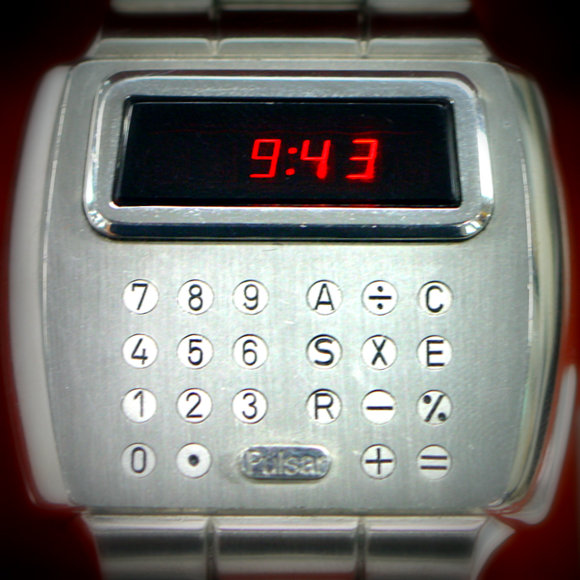 では説明します。初のデジタル腕時計が発売されたのは1972年、パルサーの「タイムコンピュータ」というモデルです。この時計は、従来の針で時刻を表す“アナログ表示式”とは異なり、針を使わない“デジタル表示式”でした。しかも、その時刻表示には、「LED(light emitting diode)」、つまり、発光ダイオードを利用しました。LED腕時計は、この新たな表示方法により、時計業界に革命を起こしたのです。