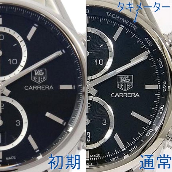 カレラ1887クロノグラフの初期モデルは、その後の通常モデルに比べて変更点があります。その変更点ですが、細かな点はありますが、最も分かりやすい点は「初期モデルにはタキメーターがない」という点です。この点は分かりやすいポイントですので、初期モデルだけがもつ特別仕様という捕らえ方ができ、特別感があります。