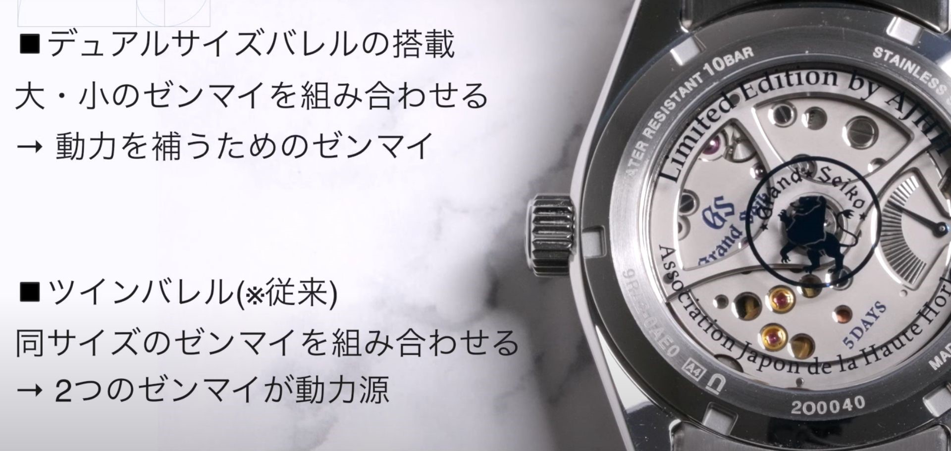 この仕組みは、2008年にセイコーが発表した「トルクリターンシステム」の応用です。「トルクリターンシステム」は、ゼンマイが減った時に「巻き直す」発想で開発されました。「デュアルサイズバレル」は、この「巻き直す」発想を取り入れたものです。