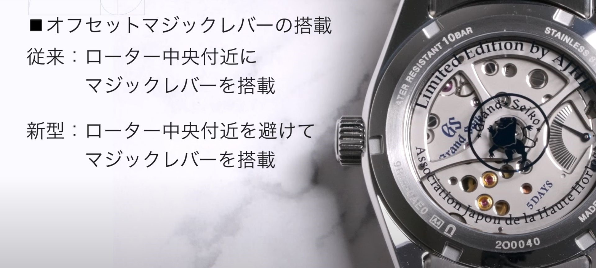 従来の9R6は厚さが5.8mmでしたが、新型の9RAは0.8mm薄くなり、約5.0mmとなりました。一部でスプリングドライブのムーブメントは大きいという意見がありましたが、この改善はメーカーの配慮が見て取れます。